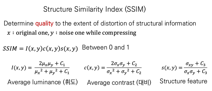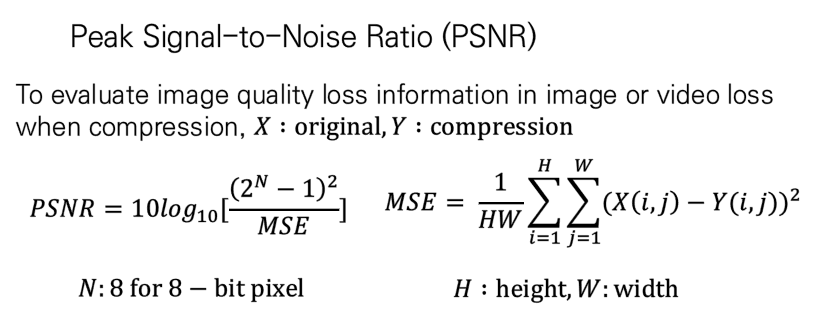 PSNR는 Peak Signal-to-Noise Ratio의 준말로, 해당 이미지의 압축 (예를 들어 .jpeg 같은 파일로 압축을 시킨다고 했을 때 ) 시 발생하는 손실을 바탕으로 주어진 이미지나 영상의 퀄리티를 측정하는 대표적인 함수입니다. 예를 들어 위 수식에서 X를 본래, Y를 압축한 녀석이라고 했을 때, MSE는 그 차이를 나타내는 noise구요, 픽셀 별 할당되는 신호 값을 (2^n-1)^2 로 좌변의 분자 항처럼 정의가 되면, PSNR은 이 잡음 대비 신호의 값을 나타내는 형태로 구성이 됩니다. 이 PSNR은 db단위로 구성이 되며 클수록 이미지/영상의 퀄리티가 좋다고 할 수 있습니다. 보통 30이 넘는 경우 매우 품질이 좋은 것으로 분류된다고 하네요.