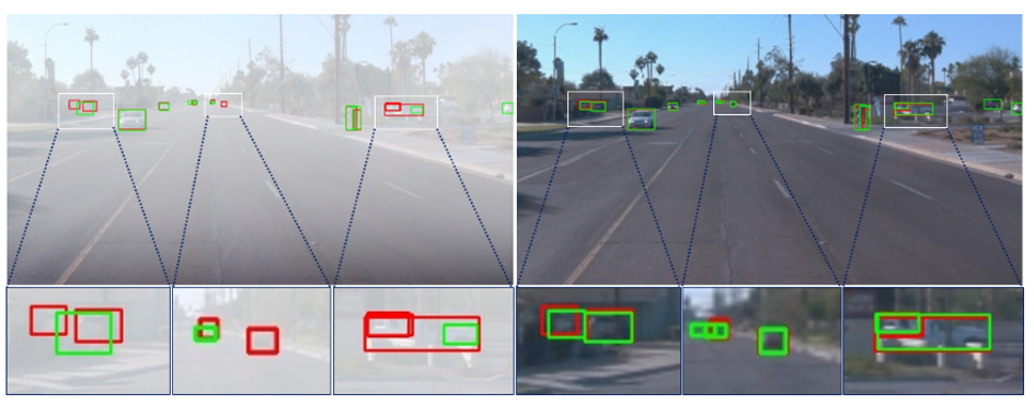 오른쪽의 경우 haze가 없는 이미지, 왼쪽의 경우 haze가 낀 경우의 이미지입니다. 오른쪽과 다르게 왼쪽에서는 bounding box가 정확하게 형성되지 않은 경우를 볼 수 있습니다. 이렇듯, 실제 object detection 같은 task를 수행할 때 image가 noise가 끼게 되면 제대로 사물을 분간하지 못하는 문제가 발생하죠. 이런 경우는 자율 주행과 같은 문제를 풀 때는 치명적일 수 있습니다. 이는 다양한 산업에서 중요한 기술이고 실제 많이 연구가 되고 있는 분야입니다.