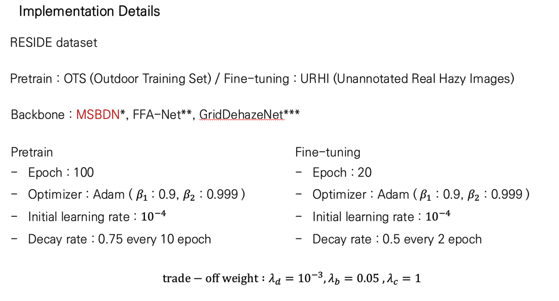 backbone 모형으로는 dehaze SOTA 모형인 MSBDN, FFA-Net, GridDehazeNet을 사용하였고 당시 가장 퍼포먼스가 좋았던 MSBDN 기준으로 실험을 진행하였습니다. 구체적인 파라미터 셋은 위의 슬라이드를 참고하시면 될 것 같습니다.