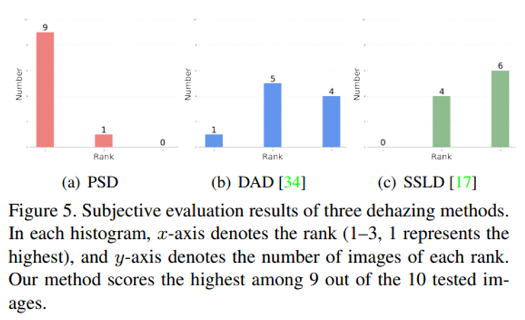 하지만 이 실험 결과는 다소 객관적이지 못하니 또 다른 실험을 거치는데요. 바로 실제 10명의 피실험자를 대상으로 10개의 데이터셋을 주고 어떤 이미지가 haze-dehaze pair 쌍인 지를 확인하는 실험을 거쳤고, 실제 이 경우도 PSD가 가장 우수한 결과를 보였다고 합니다.