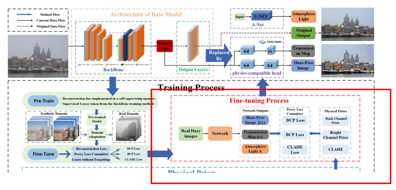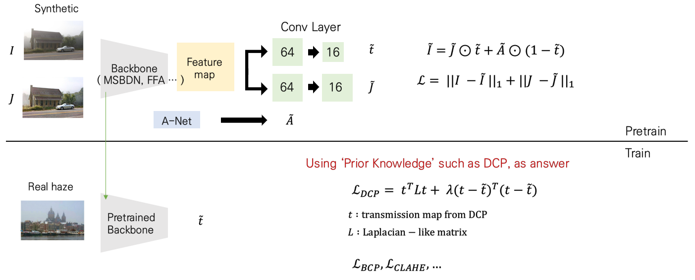 supervised setting에서 dehaze를 푸는 backbone 모형 ( 본 논문에서는 MSBDN, FFA-Net, GridDehazeNet을 사용하였습니다. ) 들을 바탕으로 feature map을 추출하면, 이들 뒷단에 physics-compatible head라는 2개의 convolutional layer를 붙여주어 t와 J에 대한 예측 값을 내놓습니다. 그리고 A-Net이라는 녀석을 별도로 구성해서 A에 대한 예측 값을 도출하여 이들을 바탕으로 haze이미지를 재구성합니다. 그러면 저희는 J와 I의 예측값을 각각 도출하였으므로 각각에 대한 재구성 오류 loss를 구성해서 pre-training을 수행하게 됩니다.