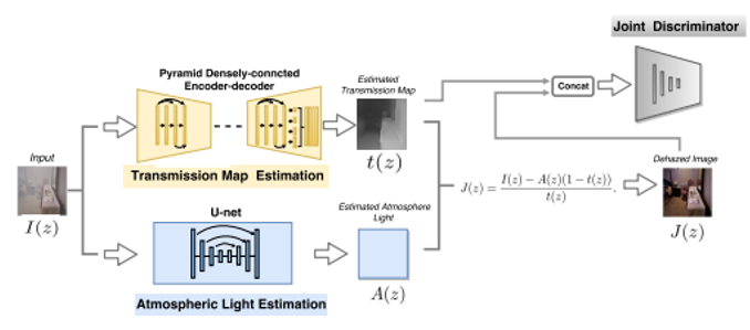 또한 A-Net이라는 걸 가져왔는데, 이는 DCPDN이라는 2018년 논문에서 등장한 방법으로 Airlight를 따로 U-Net 모델을 기반으로 추정하는 네트워크를 의미합니다. 구체적으로 DCPDN에 있는 그림을 가져와보면 다음과 같습니다.
