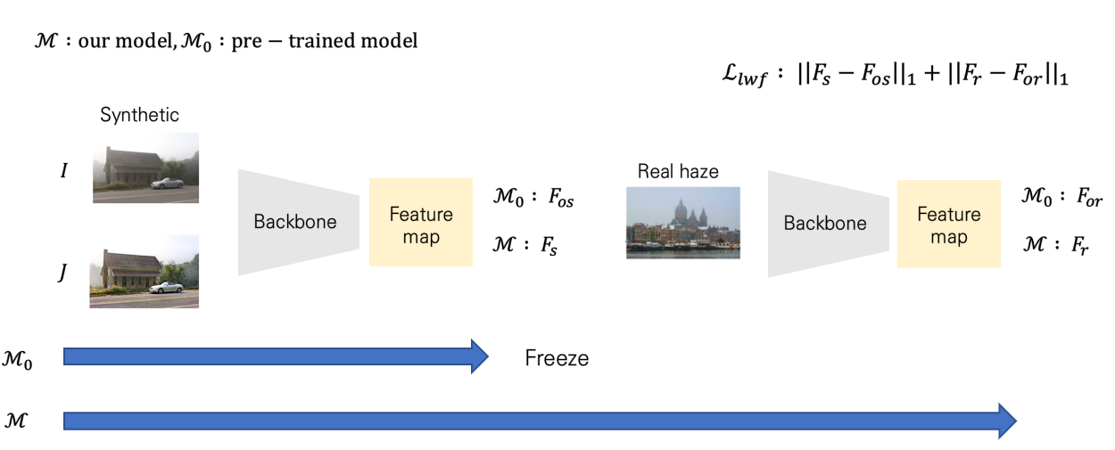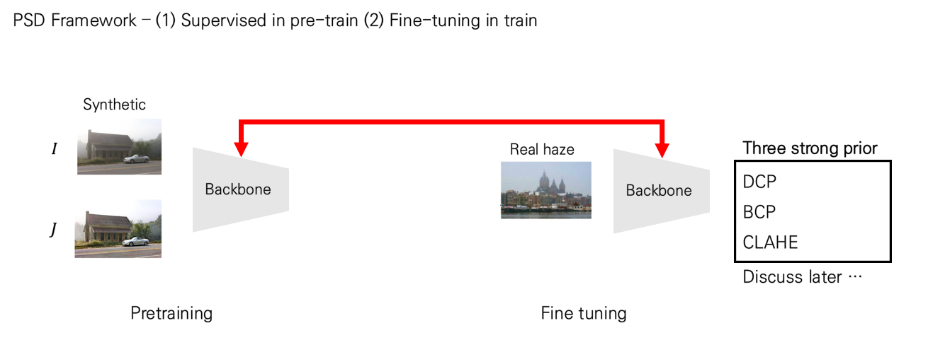즉, 크게 step을 pre-training과 fine-tuning 으로 나뉘게 되는데요, synthetic한 데이터쌍을 가지고 supervised learning을 수행한 backbone 모형을 바탕으로 real data를 바탕으로 dehazing을 학습할 때 fine-tuning을 함으로써 둘 간의 domain gap을 줄이면서 dehaze task를 더 강화하는 방법으로 아키텍처가 구성되게 됩니다. synthetic 데이터쌍에서는 앞서 언급드린 재구성 오류를 사용하고 unsupervised step에서는 여러 prior (사전 지식)들을 바탕으로 loss를 구성하게 되는데 자세한 사항은 뒤에서 소개해드리겠습니다.