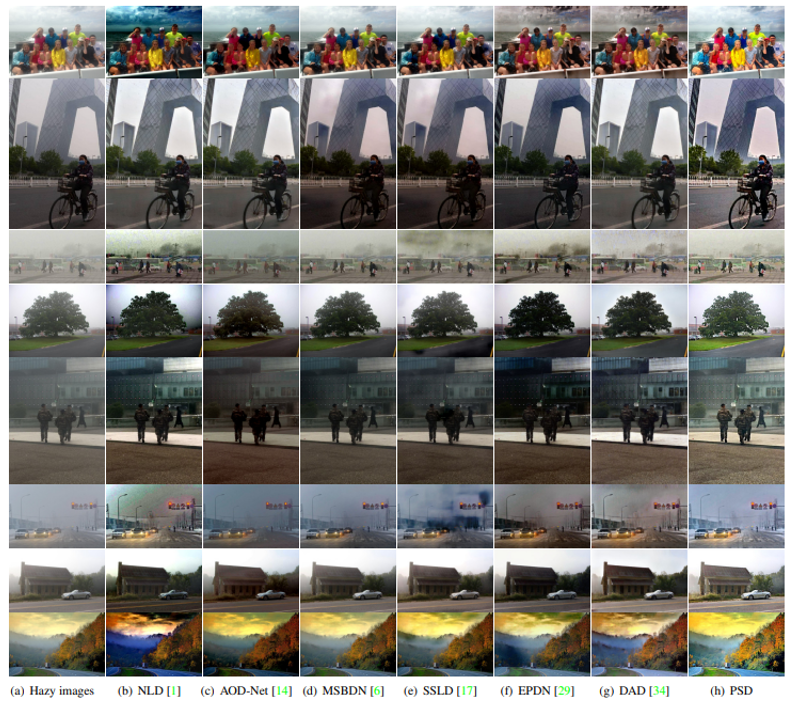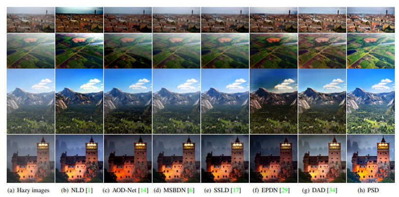 Chen, Z., Wang, Y., Yang, Y., & Liu, D. (2021). PSD: Principled synthetic-to-real dehazing guided by physical priors. In Proceedings of the IEEE/CVF conference on computer vision and pattern recognition (pp. 7180-7189).