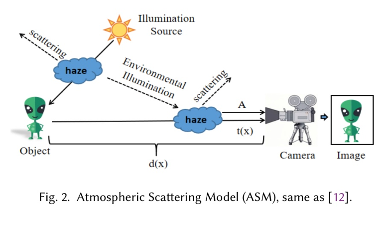다양한 noise 중에서 특별히 'haze' 문제에 다루어보도록 하겠습니다. Haze란 물체로부터 반사된 후에 대기를 통과하면서 일부 손실된 빛과 주변 광원으로부터 시야로 들어오게 되는 대기 산란광(Airlight)이 섞여서 발생하는 현상입니다. 이러한 현상으로 인해 우리 눈에는 뿌연 현상이 나타나게 되는 것입니다. 이를 잘 설명한 이론이 바로 Atmospheric Scattering Model (ASM) 입니다.