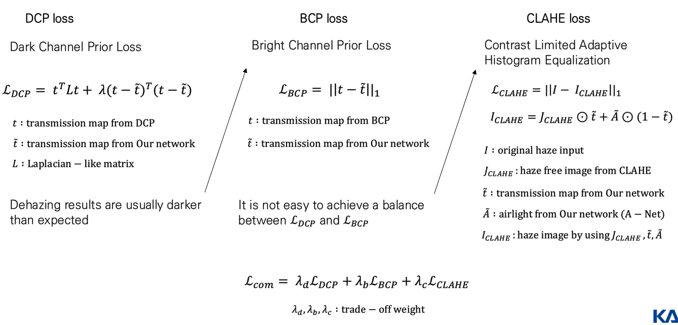 dark channel value를 구했을 때는 haze-free가 더 어두운 경향, bright channel 관점에서는 더 밝은 경향이 있으니, 이 둘을 같이 loss로 사용하게 되면 balancing하는 부분에서 어려움을 겪는 경향이 있습니다. 따라서 별도의 loss를 추가하게 되는데 이것이 바로 전통적인 dehazing 문제를 푸는 statistics-based 방법인 Contrast Limited Adaptive Histogram Equalization (CLAHE) 입니다. 이는 별도로 dehazing 결과를 내놓는 모형이기에 이 때 예측한 J를 바탕으로 I를 구성해 재구성 오류를 바탕으로 loss를 디자인합니다.