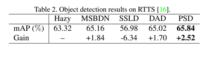자 이제, 실제 dehazing이 잘 되었는지 보려면, 이미지 개선 이후 실제 high-level task를 잘 수행하는 지를 봐야겠죠. 대표적으로 저자는 Object detection을 수행하였고 모형으로는 YOLOv3를 사용하였습니다. 이 때, pre-processing으로만 PSD를 사용하였고 joint learning은 수행하지 않았습니다.