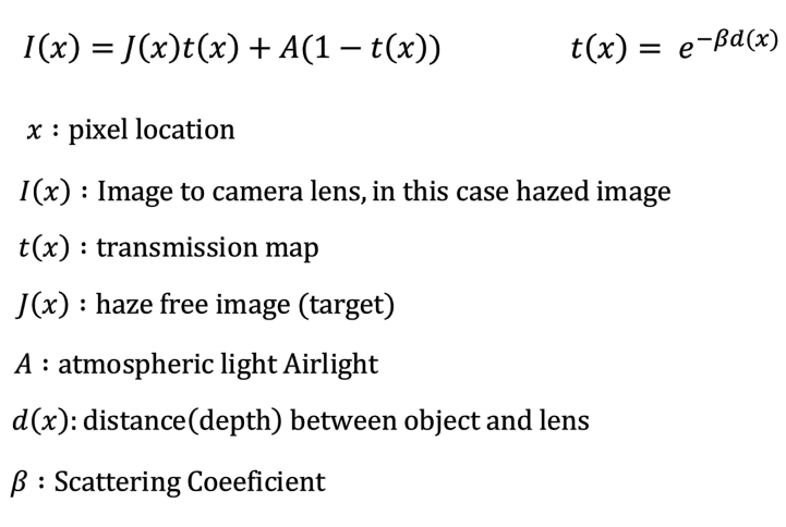저기서 중요한 요소는 바로 haze가 없는 본래 이미지 J와, 대기 산란광 A, 대기 투과율의 정도를 나타내는 transmission map인 t, 그리고 물체와 렌즈 사이의 거리인 d입니다. 이 구성요소로 haze는 설명될 수 있는데요. 구체적인 수식은 아래와 같습니다.