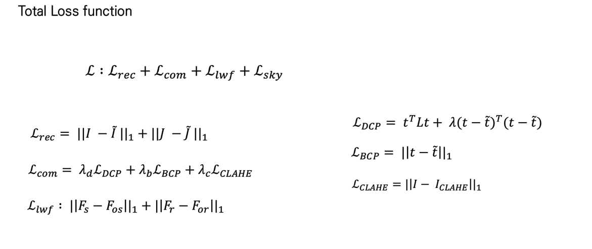 이 외에도 sky에 대한 DCP의 한계를 극복하고자 추가적인 loss term을 두어 최종 loss function을 구축한 결과는 다음과 같이 구성됩니다.