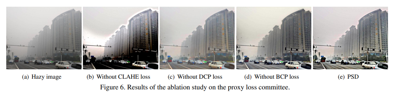 추가적으로 저자는 Prior Loss Committee들에 대한 ablation study를 진행했는데요. 결과론적으로는 세 prior loss들을 다 사용했을 때 가장 natural한 dehaze image가 나왔다고 합니다.