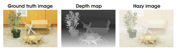 상식적으로 알 수 있듯 ( haze, haze-free ) 이미지의 동일한 pair 쌍을 구축하는 것은 쉽지 않습니다. 더욱이 outdoor의 이미지의 경우는 여러 이미지의 상황이 바뀔 변수가 존재하기에 동일한 쌍을 얻는 것은 더더욱 어려운 상황입니다. 이러한 상황에서 앞서 배운 ASM 공식을 바탕으로 이런 haze 이미지를 합성해서 pair dataset을 구축하는 방법들이 등장하였고 오늘날 supervised learning에서 많이 사용되는 haze 데이터셋의 대부분은 이러한 합성(synthetic) 방법으로 구성이 됩니다. 구체적으로는 아래 그림처럼 GT와 depth가 있을 때, A와 t를 조절하면서 이미지들을 만들게 됩니다.