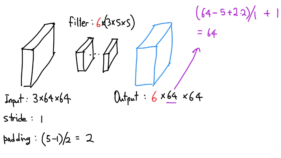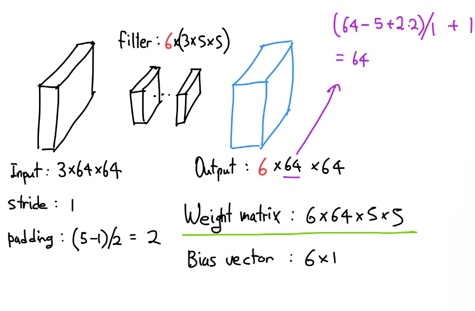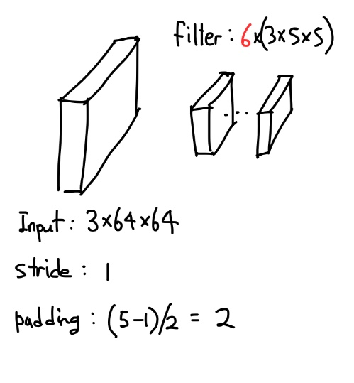 다음으로 filter 인데요, filter의 경우는 보통 input의 채널과 동일하게 가져가기 때문에 3을 했고 size는 5로 하나의 filter는 3x5x5 의 사이즈로 구성되는데 이 경우 6개의 filter를 사용한다고 하면 총 6x3x5x5로 구성이 됩니다.