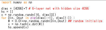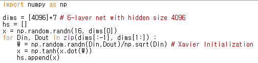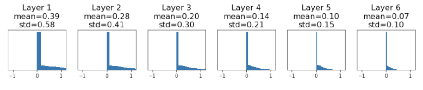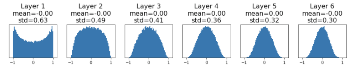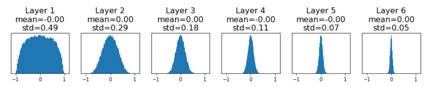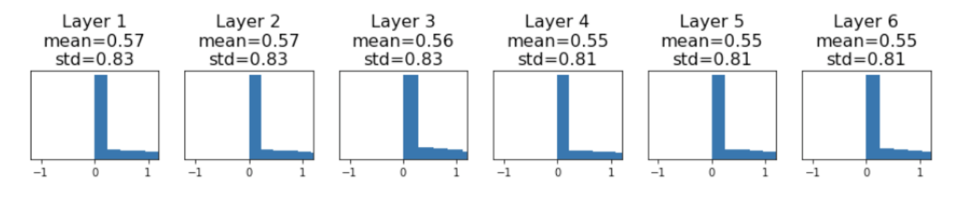 아래 코드는 Justin Johnson 교수님의 강의 자료 코드를 참고하였고 예를들면 위와 같이 6-layer로 되어 있는 신경망을 가정하게 되면 가중치 W를 랜덤하게 초기화해서 network를 디자인했다고 했을 때, 각 hidden state에 들어오는 입력들의 분포는 다음과 같이 나온다고 합니다.