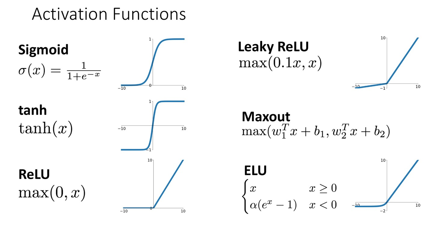 딥러닝의 '비선형성'을 부여해주는 대표적인 역할을 하는 것이 바로 활성화 함수입니다. 일반적인 linear regression이 분류 task를 수행할 수 있게 고안된 것이 바로 sigmoid 함수인데 이 역시 마찬가지로 활성화 함수의 기능을 수행하게 됩니다. 대표적으로는 아래 그림과 같은 종류들이 존재합니다.