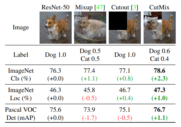 CutMix는 기존 Cutout이 0으로 넣어버리는 부분에 있어 정보 손실, Mixup에서 발생하는 기존 이미지의 왜곡을 방지하기 위해 다른 class의 이미지를 집어 넣음으로서 기존 한계를 개선하고 image classification 뿐만 아니라 localization ability를 키움으로서 더 robust한 모형을 만들 수 있었다고 언급합니다. 이 방법 또한 다양한 augmentation 기법으로 많이 활용됩니다.