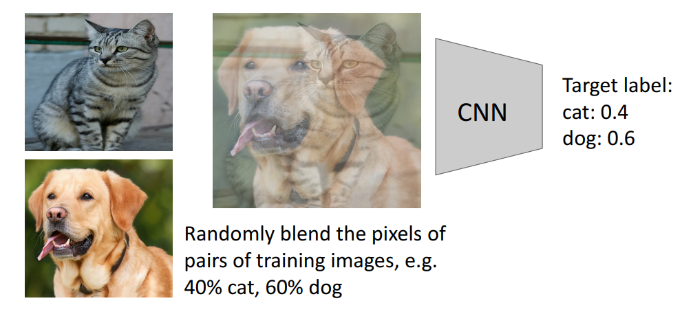 Mixup은 말 그대로 서로 다른 클래스의 랜덤 pair에 대해 weight combination을 통해 혼합된 데이터를 generate해서 학습에 사용하는 방법입니다. 이를 통해 학습의 안정성을 꾀하는 방법입니다.