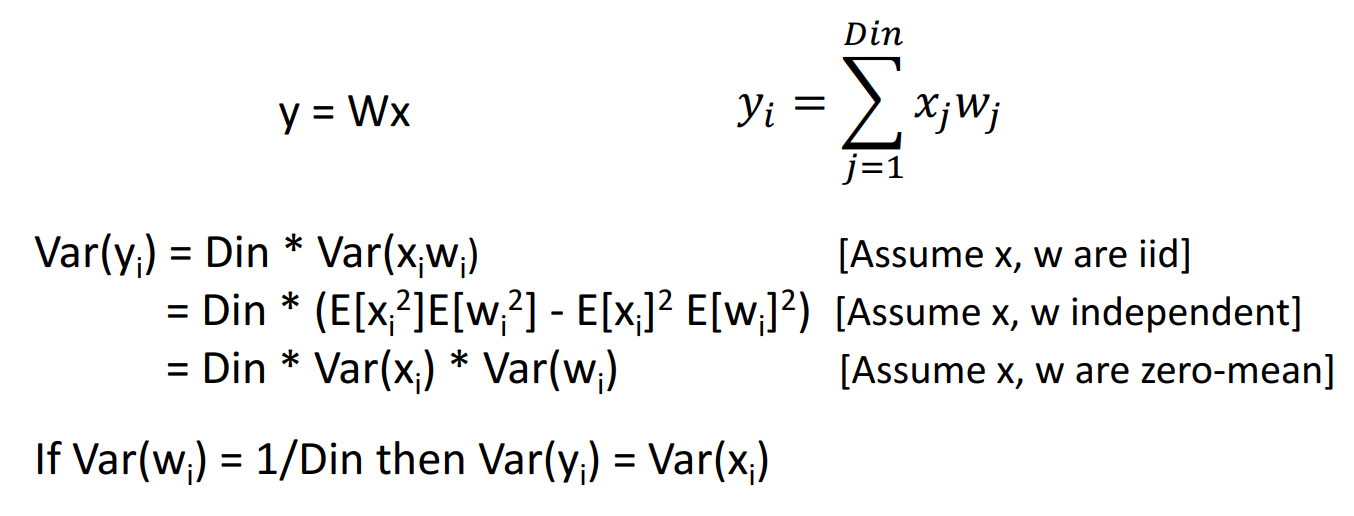 즉, Var(yi)와 Var(xi)가 동일할 조건은 Var(wi) = 1/Din 이 되는 경우 xi와 yi의 분산이 같아지게 됩니다.