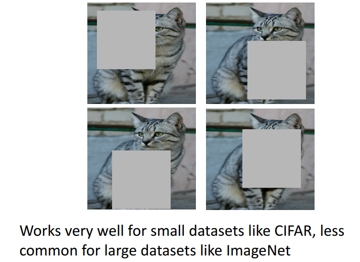 Cutout은 어떨까요? 이렇게 중간 중간 고양이의 부분을 cutout해버리게 되더라도 사람은 충분히 저 그림이 고양이라는 것을 인식할 수 있으므로 이를 통해 모형을 더 robustness하게 만들 수 있는 전략입니다. 그리고 이 방법은 object occlusion이라는 문제를 해결하고자 등장한 방법이기도 합니다.