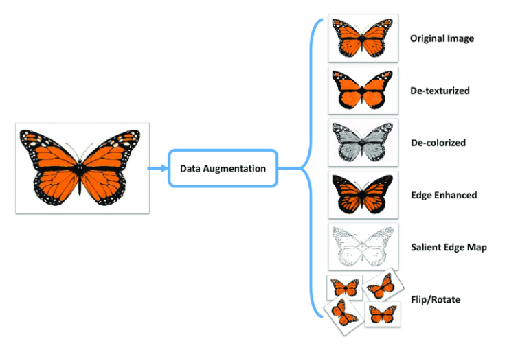 예를 들어 위 그림의 경우 왼쪽의 경우도 나비, 오른쪽의 경우도 나비라고 사람은 인식할 수 있지만, 머신의 경우 왼쪽의 나비만 학습한 상태에서는 오른쪽을 나비로 인식하지 못하는 문제도 존재합니다. 따라서 이를 다양한 변화를 주고 이 역시 나비로 인식하게끔 모형을 학습시키면 이러한 문제에 대응할 수 있습니다. 이것이 바로 data augmentation의 개념입니다.