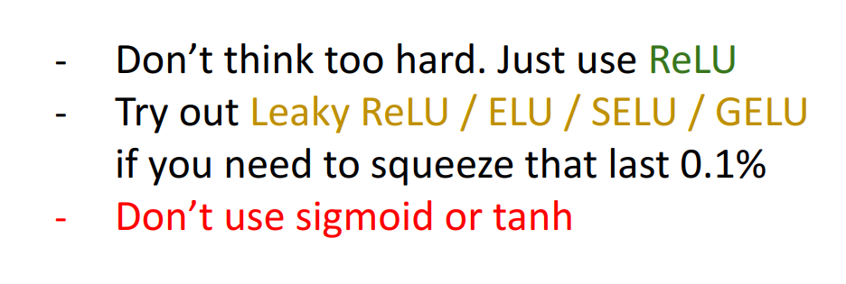 그럼 대체 뭘 쓰냐? 이 질문에 Justin Johnson 교수님은 그냥 심플하게 결론을 내립니다. Just use ReLU. 즉 ReLU 쓰면 됩니다. 복잡하게 생각하지 맙시다.