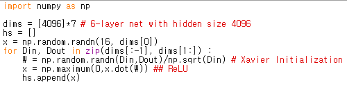 이 Xavier initialization의 경우 활성화 함수의 입력이 zero-centered를 가정합니다. 즉, 그 말은 ReLU 같은 zero-centered가 아닌 경우는 Xavier initialization를 사용해도 학습이 잘 이루어지지 않는다는 것을 의미하기도 합니다.