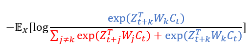 $\mathcal{L} = -E_{X}(\log\frac{P}{Q}) = -E_{X}(\log\frac{\exp(Z_{t+k}^{T}W_{k}C_{t})}{\sum_{j \neq k} \exp(Z_{t+j}^{T}W_{j}C_{t})})$