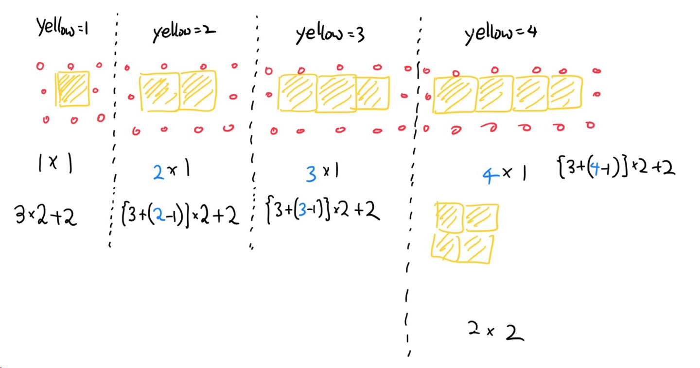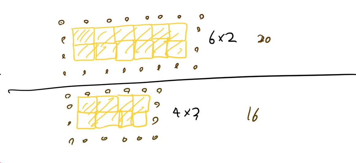 만약 동일하게 yellow가 예를 들어 12가 주어질 때 이는 아래 그림처럼 6x2인 경우도 존재할 수 있고 4x3인 경우도 존재할 수 있다. 이 때는 각각 brown의 수가 20과 16으로 다른 케이스가 된다.