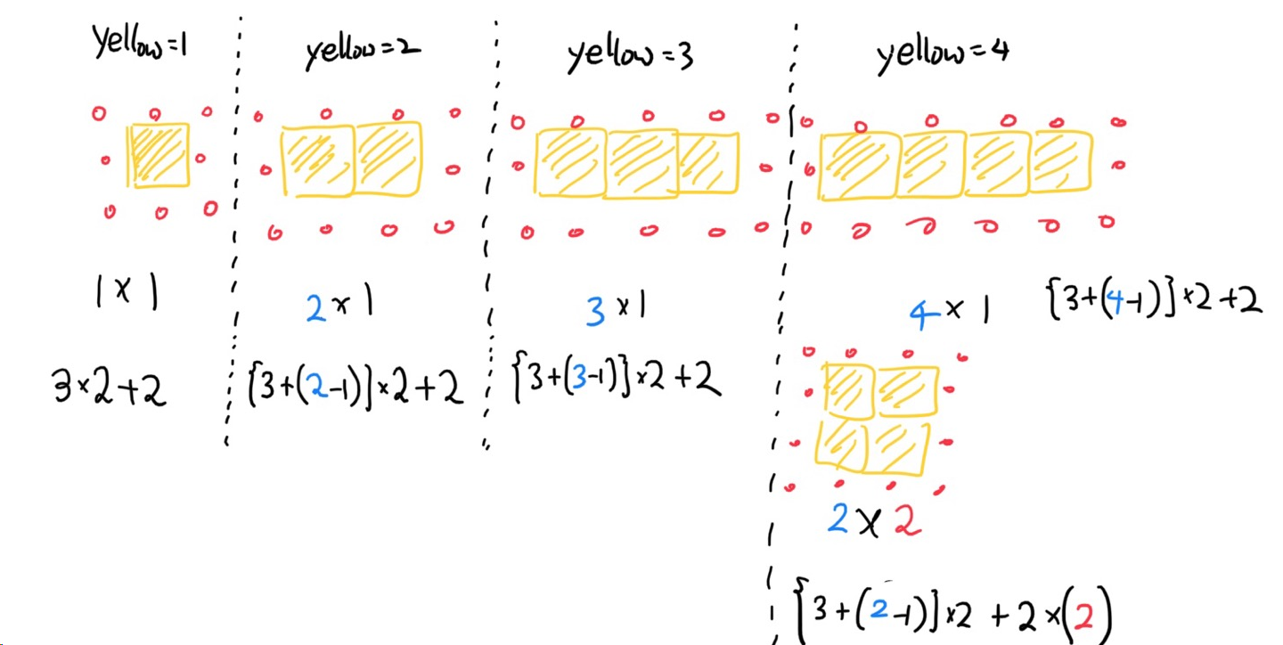 아래 수식처럼 1x1 에서 2x1, 3x1로 넘어갈 때 마다 위 그림에 수식으로 적어놓은 규칙이 있음을 확인하였고