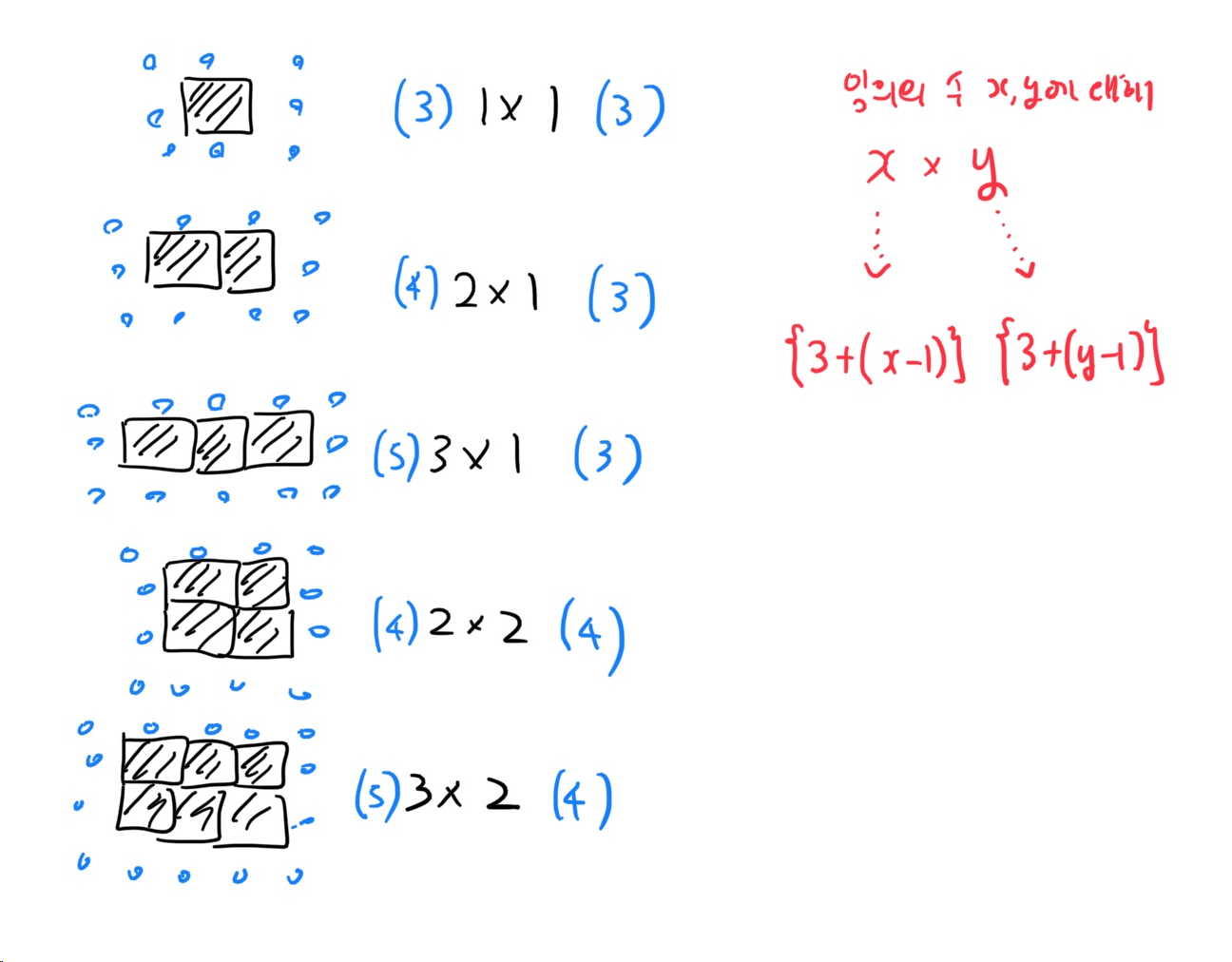 반면 세로로 증가시킨 경우는, 예를 들어 2x1에서 2x2로 넘어가는 경우 아래 그림과 같은 규칙이 형성된다.