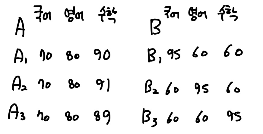 B : 국어 95 영어 95 수학 95 로 집단의 최고는 B가 더 높게 된다.