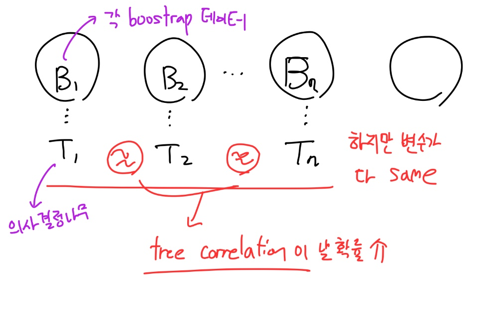 그렇다면 궁금한 점이 저 부분을 극복하기 위해 각 트리 별로 변수를 랜덤하게 뽑게 되면