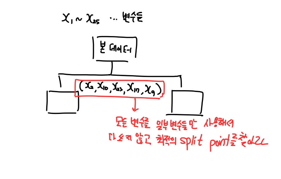 25개를 전부 사용하지 않고 본 데이터에 대해 일부 변수들만 사용해서 최적의 split을 찾게 한다.