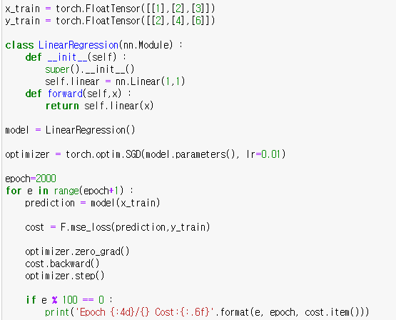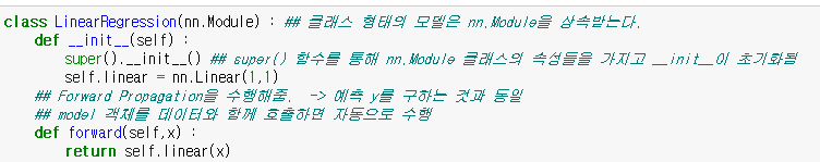 우선 모형을 만들 때 nn.Module을 상속받고 super() 함수를 통해 자동으로 __init__을 nn.Module 것을 상속받게 한다. 또한 forward 함수를 통해 예측 y를 구하는 바를 해당 수식을 통해 가볍게 구현할 수 있다.