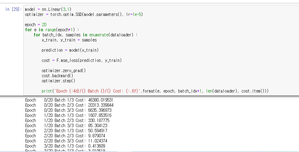 전체 데이터를 5등분을 수행하게 각 batch 마다 Gradient Descent를 수행하게 된다. 이 Gradient Descent를 전체 데이터에 수행하면 1번의 epoch가 수행되게 된다.