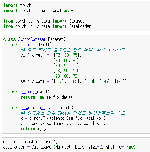 앞서 구현하였던 다중 선형 회귀를 돌리는 데이터셋을 정의하는 커스텀 데이터셋을 다음과 같이 사용할 수 있다.