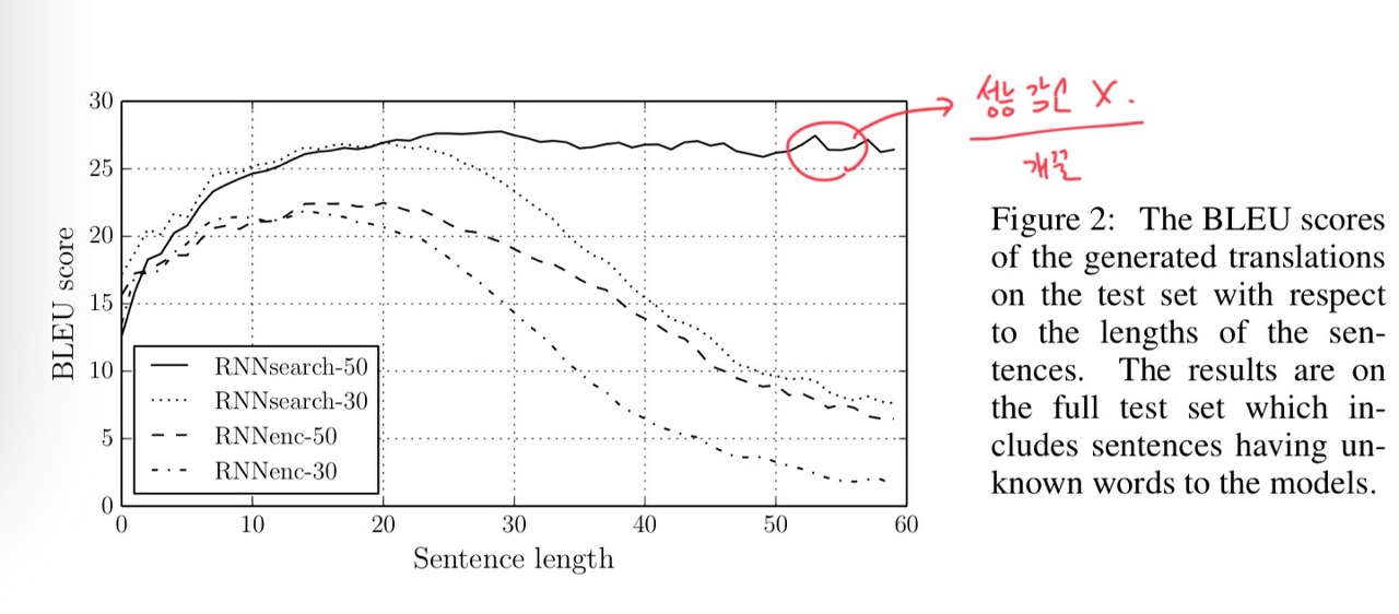 다음 그림의 경우 만일 문장의 길이가 20을 넘어가게 되면 점점 번역의 정확도가 감소하는 것을 확인할 수 있다.