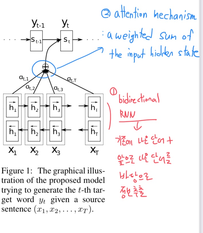 기존 seq2seq에서 마지막 hidden state의 1개만 가지고 context vector를 구축하는 것이 아니라 모든 hidden state를 다 살려서 그 친구들의 조합을 활용하여, 주어진 target word (input)과 가장 관련이 있을 것 같은 부분은 어디인지 찾아내는 네트워크를 추가하는 것으로 문제를 해결하고자 하였다.