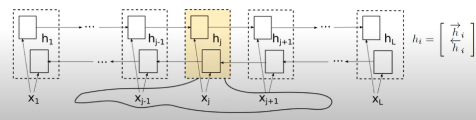 이 과정에서 각각의 hidden state를 구축할 때는 주변의, 예를 들어 hj를 구축하기 위해 xj-1, xj, xj+1의 정보를 활용하여 hidden state를 구축하게 되는데 ( 가중치 합으로 ), 이러한 부분에서 가변적인 길이를 반영할 수 있다고 한다.