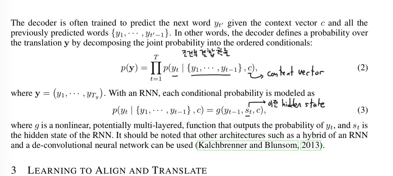 그리고 이 context vector를 바탕으로 decoder에서 가장 조건부 결합 확률이 높은 워딩으로 번역되어 동작한다. 이 때도 hidden state는 번역이 되는 언어의 맥락을 담고 있는 LSTM에 의해 구축이 된다.