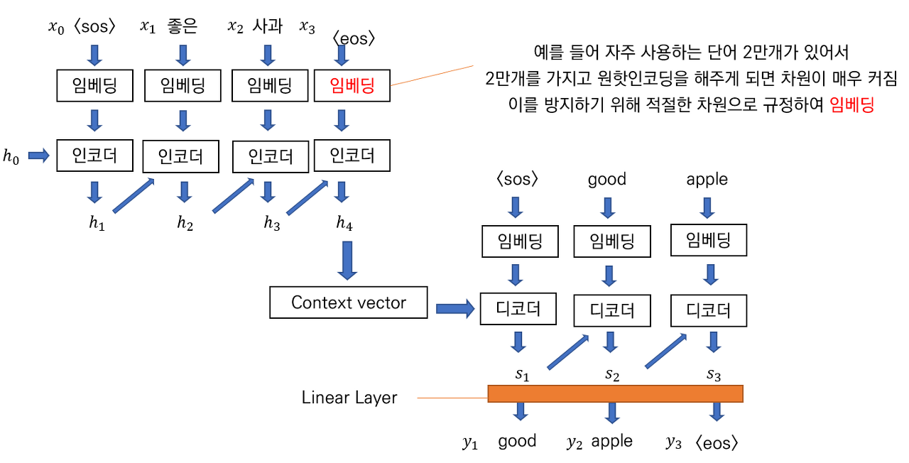이 부분이 바로 인코더에서 마지막 hidden state를 context vector로 사용할 때 그 크기가 기존 input size와 동일한 크기로 고정이 된 것을 의미하게 된다. (학습 시)