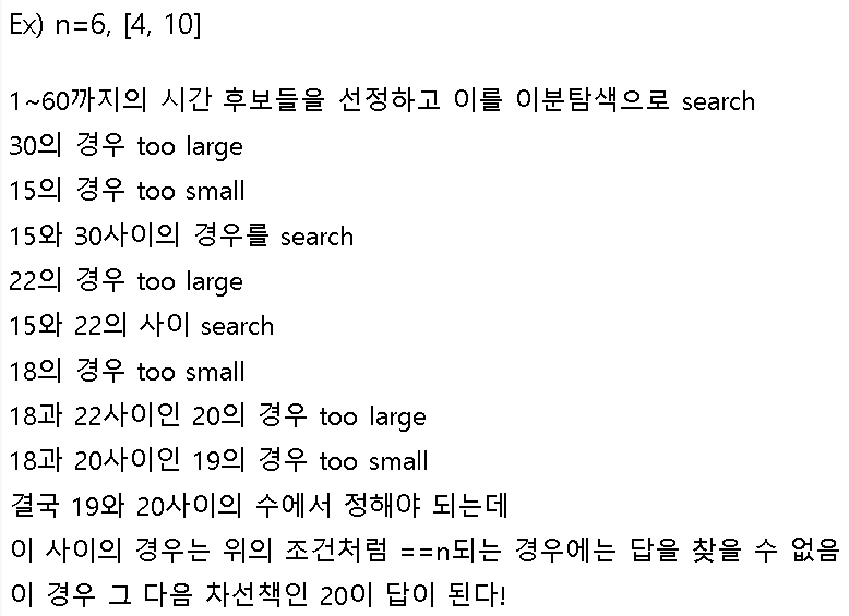 따라서 시간을 더 늘리는 방향으로 갈 수 있다. → 이 search를 이분 탐색을 이용한다!