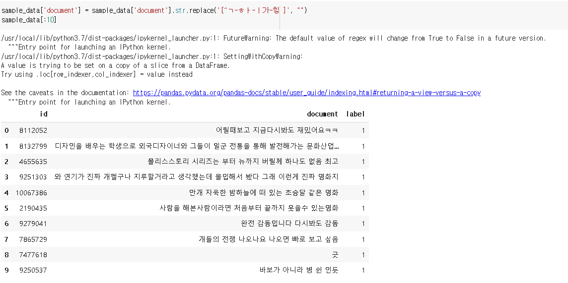 id는 영화의 id, document는 리뷰, label은 긍정이냐 부정이냐를 판단하는 레이블입니다.