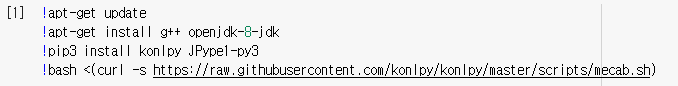 한국어 토큰화 처리 패키지를 사용하기 위한 다음의 설치 과정을 수행해줍니다.