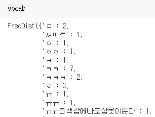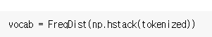 다음으로 nltk 패키지에 있는 FreqDist를 통해, 단어의 빈도 수를 계산하여 dictionary 형태로 반환해주는 객체를 생성합니다.