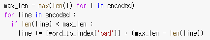 이제 현재 있는 토큰 목록 중 가장 길이가 긴 것을 기준으로 길이를 통일해주는 과정을 거칩니다.
