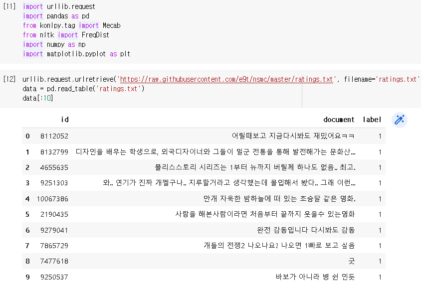 우선 깃헙에 있는 네이버 영화 리뷰 데이터를 불어와 직접 분석을 시도해보도록 하겠습니다.