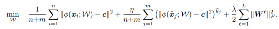 저기서 c는 쉽게 말하면 사전 학습을 통해 normal 데이터 학습을 통해 가장 normal을 잘 나타내는 feature representation으로 보면 될 것 같습니다. 여기서 주어진 input xi를 feature representation을 시키는 파이 함수를 통해 계산된 값이 c로부터 거리가 가까울 수록 normal, 멀수록 abnormal에 가깝게 판단을 하게 됩니다. 그 정도를 가지고 loss를 최소화하는 함수입니다. 이 경우 어떠한 것이 normal인지, abnormal인지를 label이 되어 있지 않는 경우이기에 다음과 같이 loss function이 디자인됩니다.