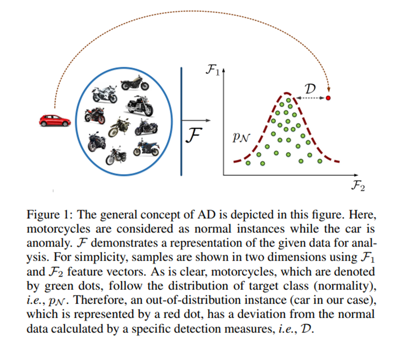 본 그림을 보면, 일반적으로 파란색 원 안에 들어가 있는 데이터들이 normal data라고 할 수 있습니다. 우리는 이 데이터들을 F라고 하는 feature representation을 통해 F1, F2를 사용하여 다음과 같은 plot을 그릴 수 있습니다. 녹색 점들의 경우 일반적으로 오토바이의 이미지들을 표현한 데이터로 볼 수 있습니다. 하지만 빨간색 자동차의 경우 우리가 일반적으로 관찰한 오토바이와는 조금 다른 특징을 가지게 됩니다. 이 경우 F를 통해 representation을 하게 되면 일반적으로 다른 위치에 데이터가 존재하게 되고 그 '격차'가 바로 이 데이터를 anomaly라고 측정하게 되는 기준이 됩니다. 이러한 방법을 통해 anomaly detection은 일반적으로 수행되게 됩니다.