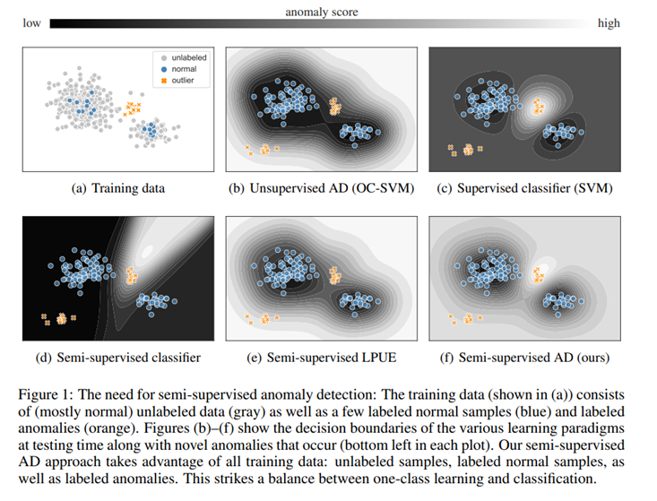 다음 그림은 unsupervised-learning의 한계점을 극복하는 차원에서 semi-supervised learning을 사용하는 것의 이점을 보여주는 그림입니다. 본 그림은 'DeepSAD' 기법으로 유명한 Ruff의 논문에서 참고하였으며 해당 논문은 기존 저자가 제안한 'DeepSVDD'의 방법을 조금 더 개선한 'DeepSAD'을 제안하였는데, 이 때가 바로 Unsupervised learning에서 Semi-supervised learning으로 방법을 더 개선한 것입니다. 조금 더 구체적으로 봐볼까요?