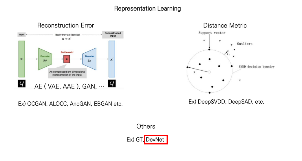 자 그렇다면 여기서 알 수 있듯이, 일반적으로 Anomaly Detection은 Representation Learning 방법을 사용하는 것을 알 수 있습니다. (물론 항상 그런 것은 아닙니다. ) 그래서 간단하게 다음 그림을 통해 정리할 수 있을 것 같습니다.